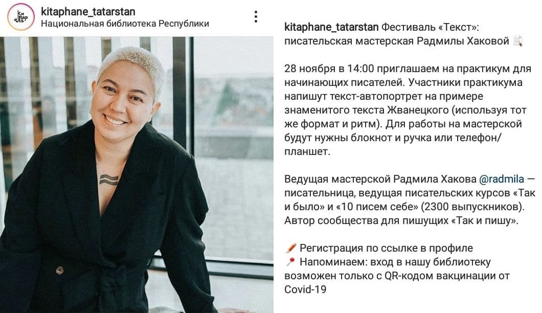 Почему по аналогичному пути решила пойти Нацбиблиотека Татарстана, все же не очень понятно. Но именно там проводит мастер-классы по писательскому мастерству автор единственной книги Радмила Хакова. С одной стороны, ясно, что главное — это модненько и красиво упаковать, а не передать огромный опыт, которого нет. С другой — по такой же схеме другой очковтирательный проект «Университет Синергия» готовит журналистов и где все ее выпускники?