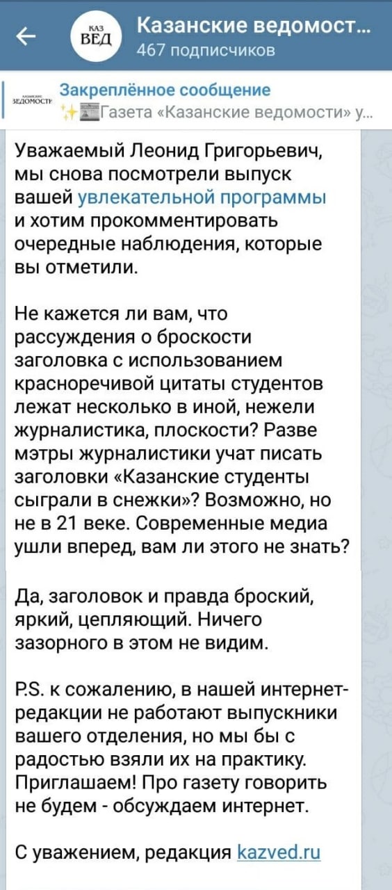 Чтобы не копаться, то вот: Леонид Григорьевич придрался к заголовку КВ и самой статье об игре в снежки студентов из Деревни Универсиады со словами: «Я пропустил тот момент, когда средства массовой информации стали просто ретрансляторами Тик-Тока?» и далее изящно постебал коллег. Местами по делу, кстати.