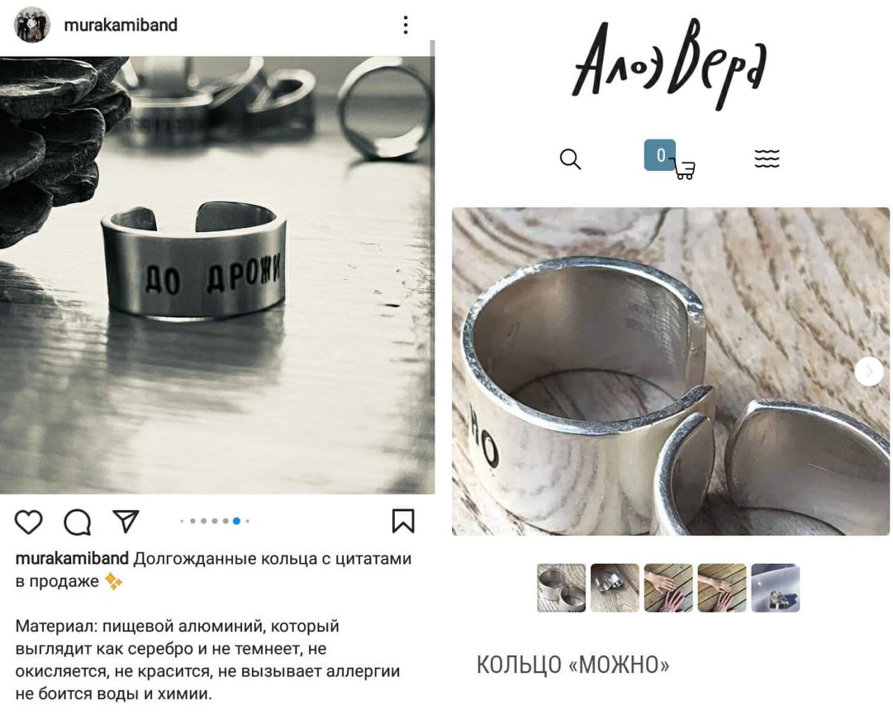 Группа «Мураками» запустила мерч в виде алюминиевых колец с надписями-цитатами из своих песен. Так то, конечно, стильно и модно, если не учитывать, что это полнейшая до мельчайших деталей копипаста идеи другой группы «АлоэВера».
