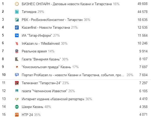А теперь к изменениям: за неделю в топ-10 вернулись ранее выбывшие оттуда «Татарстан-24», газета «Челнинские известия», но снова вылетела из десятки «Вечерняя Казань», равно как и ГТРК «Татарстан». Inkazan за семь дней тоже откатил с 11-го на 13-е место.