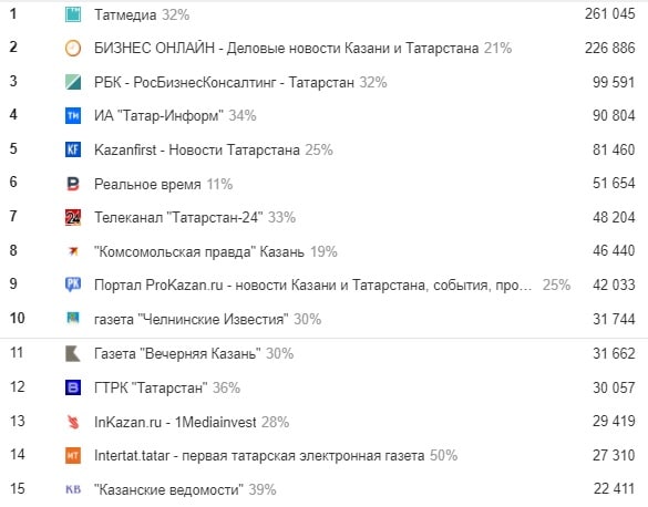 Сразу обращает на себя внимание, что самое читаемое издание, как оно само себя называет, «Бизнес-онлайн» теперь на втором месте. А с первого БО потеснил «Татар-информ». Не менее удивительно, что в топ-3 попали «Челнинские известия», выбросившие оттуда сайт «Татарстан-24».