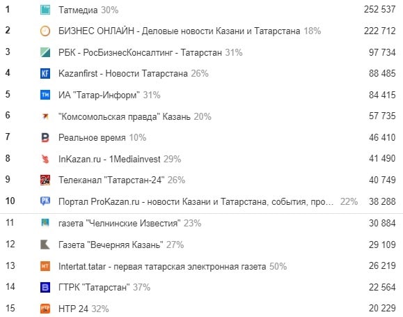 На этой же волне в топ-10 ворвался Inkazan, неделю назад плававший на 13-м месте. Также приросли за семь дней Intertat и «НТР-24», вернувшийся в топ-15. А вот «Вечерняя Казань» сползла на одну позицию. Кроме того, серьезно за счет горячей темы прибавил «Казанский репортер», занявший 16-е место (на скрине не видно) и проигравший каналу «НТР-24» буквально копейки.