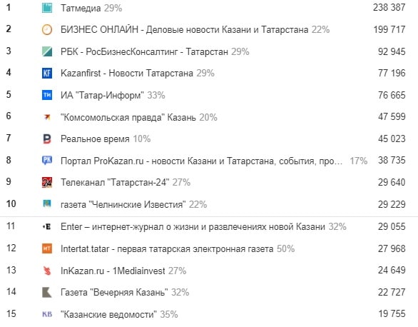 Из тех, кому немного не хватило до топ-15, можно выделить «Шахри Казан», «НТР-24» и ГТРК «Татарстан» (на скрине не видно).