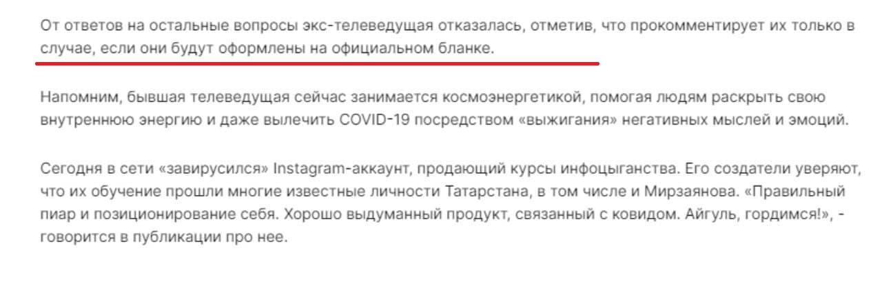 Я, конечно, все понимаю, Айгуль Мирзаянова великая теледива, получившая ТЭФИ, и просто "некосмическая" девушка. Но требовать от журналистов запросы на ОФИЦИАЛЬНЫХ БЛАНКАХ - это не слишком?