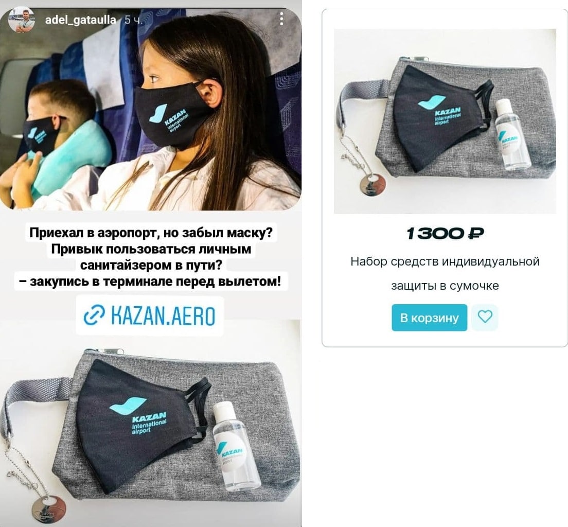 Пресс-сек аэропорта Казани Адель Гатауллин решил поработать менеджером по продажам мерча, но на всякий случай не стал уточнять, что маска с наклеенным лого микротюбик с антисептиком будут стоить 1300 рублей.