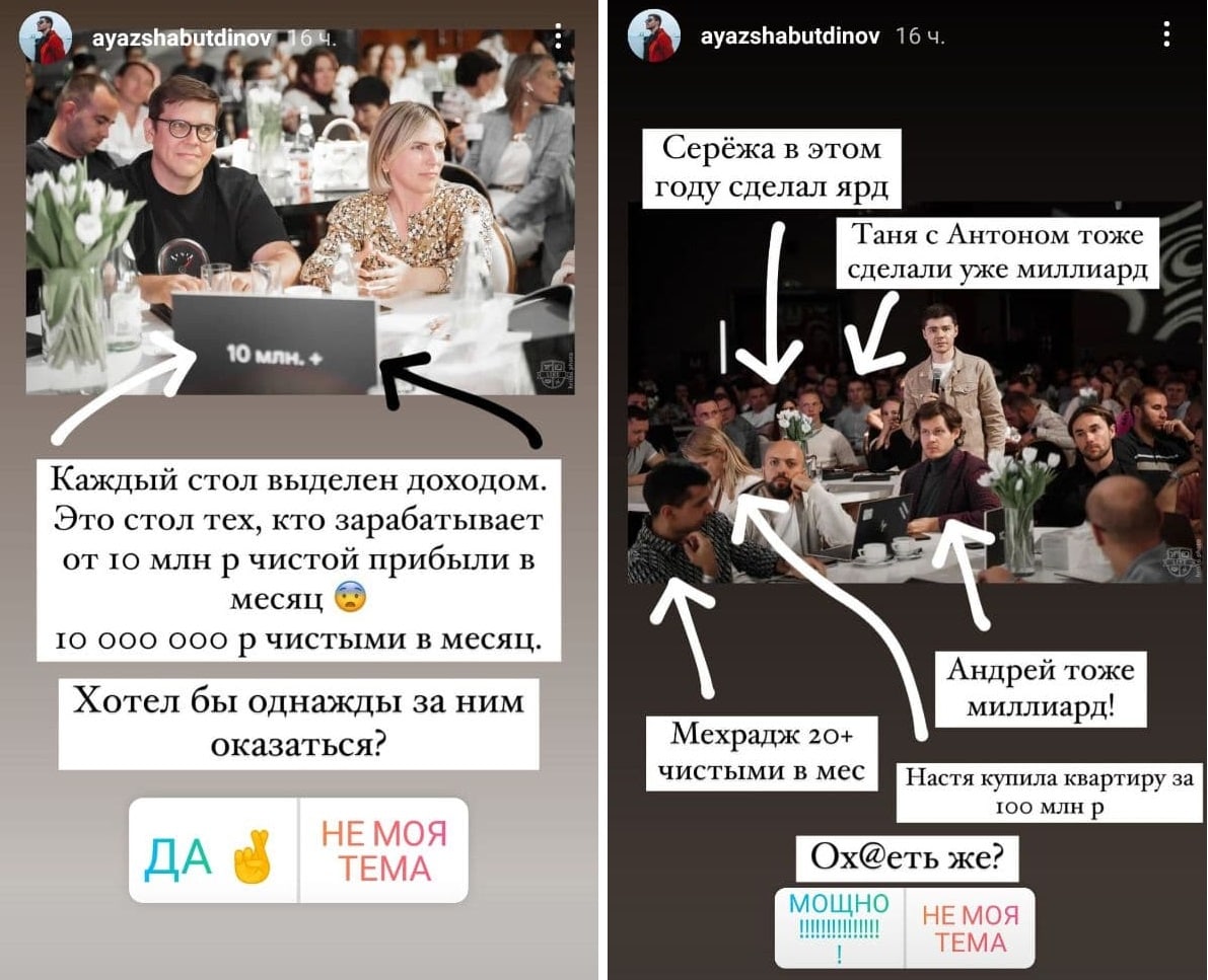 И теперь всех успешных он собрал в одном месте, чтобы сделать триллионерами. У одного хата за 100 млн рублей, у другого доход уже в миллиард, у третьего 10 млн чистая месячная прибыль. Странно, что среди его учеников нет еще тех, кто на Луну высаживался. Ведь нет ничего невозможного, когда ты пи..дабол.