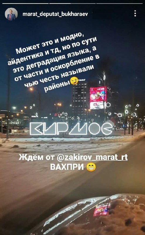 Муниципальный депутат из Верхнего Услона Марат Бухараев хейтит столичный креатив с айдентикой Кировского и Московского районов.