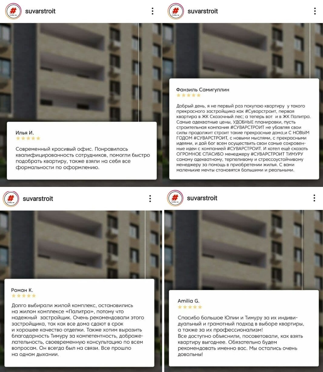Суварстроит так нелепо палится, когда выкладывает положительные отзывы о своих ЖК)) А если их почитать, то все написаны подозрительно грамотно и в одном стиле. Особенно смешно, что даже октотроп прописан в названии застройщика в отзыве.