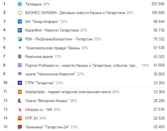 Изменения есть чуть ниже. Так, за семь дней в первую десятку вошел сайт ГТРК «Татарстан», вытеснив оттуда Inkazan. А «Реальное время» и Prokazan поменялись местами, поскольку РВ нарастил трафик.
