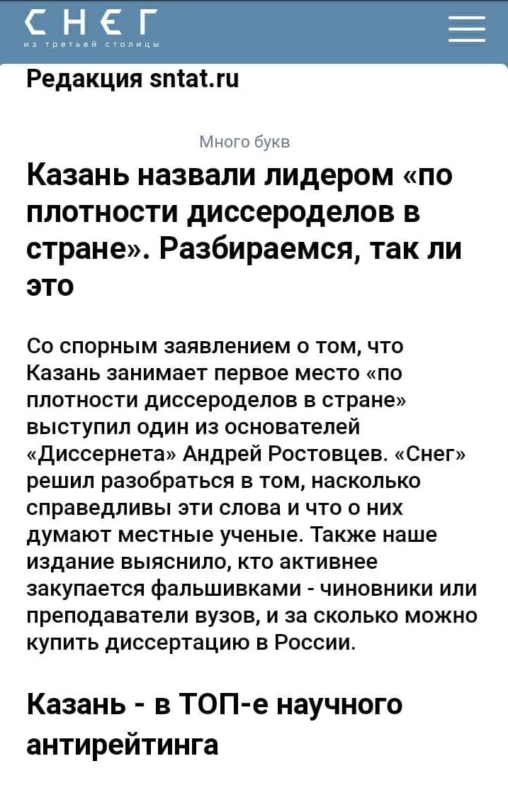 Иронично, конечно, что издание «Снег» пытается в аналитику и хоть немного отстоять честь научного мира Казани, который «Диссернетом» обвинен в тотальном плагиате. Оказывается, что по совокупности списанных диссертаций и фальшивых научных статей среди городов-миллионников Казань лидирует.