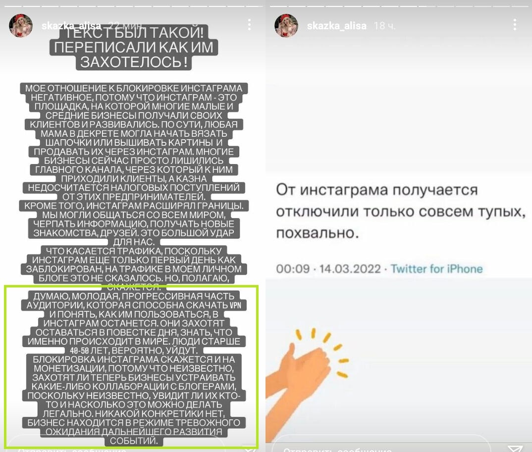 А чуть раньше блогерка постила мемы, что Инстаграм заблокировали только для совсем тупых (т.е. неспособных поставить VPN).