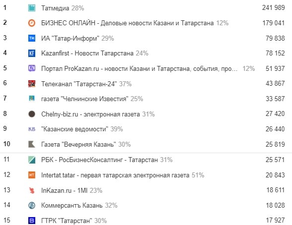 На скрине не видно, но к топ-15 подбираются «Казанский репортер» и «Коммерсант Казань».