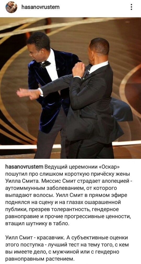 Электорат ждал серьезной аналитики на тему прогрессивных ценностей и гендерного равноправия, электорат его получил. И главное, что волновало многих: Уилл Смит красавчик? Да, депутат Хасанов авторитетно подтверждает.