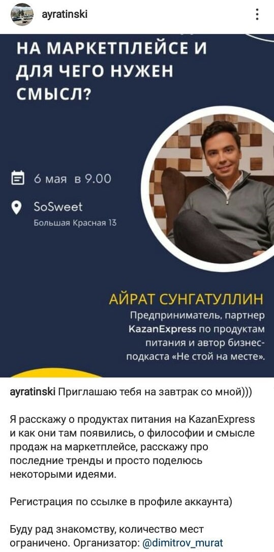 Менеджер «Казаньэкспресса» Айрат Сунгатуллин дошел до той стадии собственной офигенности, что уже проводит публичные завтраки с самим собой. Обещает рассказать о смыслах, философии и трендах.