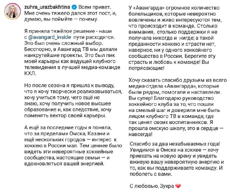 Бывшая теледива «Эфира» Зухра Уразбахтина в качестве ведущей и лица хоккейного клуба «Авангард» продержалась немного дольше, чем в свое время на «Ак Барс ТВ».