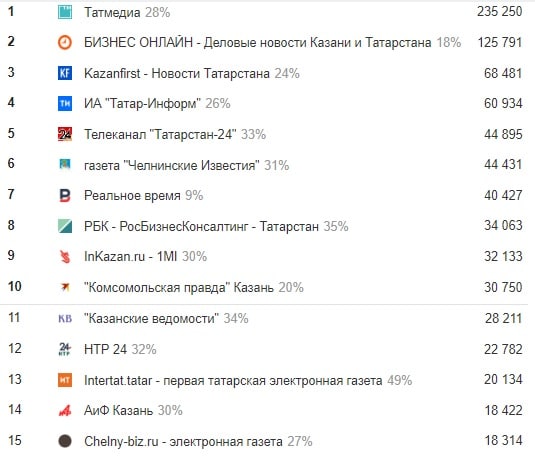 За неделю сайт телеканала «НТР-24» смог поднять в первую десятку рейтинга и выдавить оттуда «РБК-Татарстан». Впервые за долгое время в топ-15 попали «Прогород Набережные Челны» и реанимированный сайт 116.ру. К последнему есть вопросы относительно перераспределения трафика с федеральной сетки холдинга.