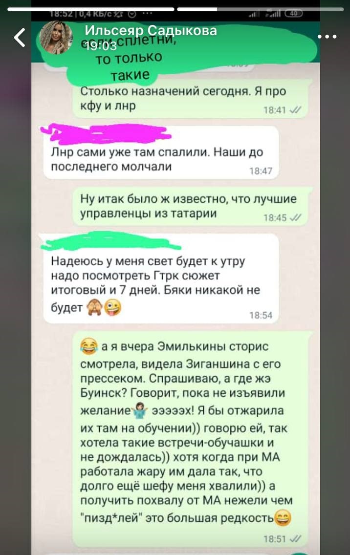 Занимательным скрином поделились на #почта. Автор письма отмечает, что это выставленная на публику (это важно) переписка пресс-секретаря «Сетевой компании» в Буинске Ильсеяр Садыковой и пресс-секретаря Госкомитета по биоресурсам РТ Ангелины Ширяевой (хотя имя собеседника замазано).