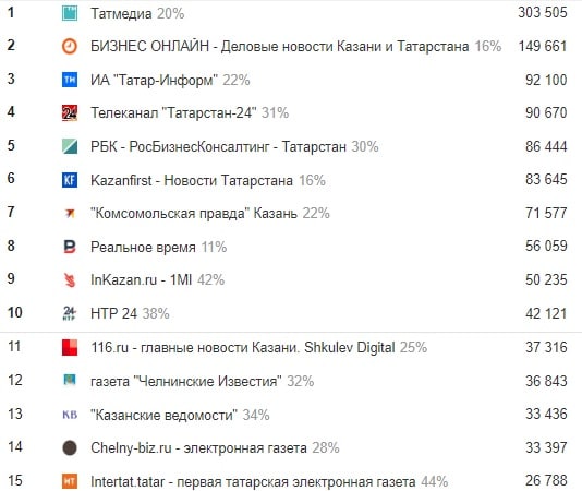 Серьезно поднялся в рейтинге сайт канала «НТР-24», вошедший в топ-10. А вот «Вечерняя-Казань» в топ-15 не удержалась и откатила сразу на 16-е. Полный расклад на скрине.