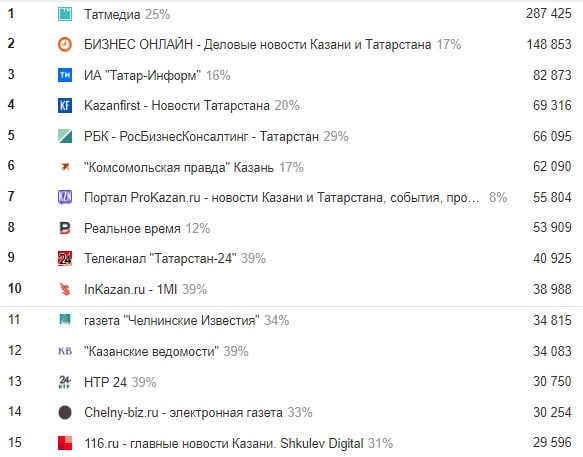 В рейтинг и сразу в топ-10 вернулся портал Prokazan, а вот сайт «НТР-24» оттуда вылетел и теперь уже на 13-м. «Вечерняя Казань» же по-прежнему не может вернуться хотя бы в топ-15. Полный расклад ниже.