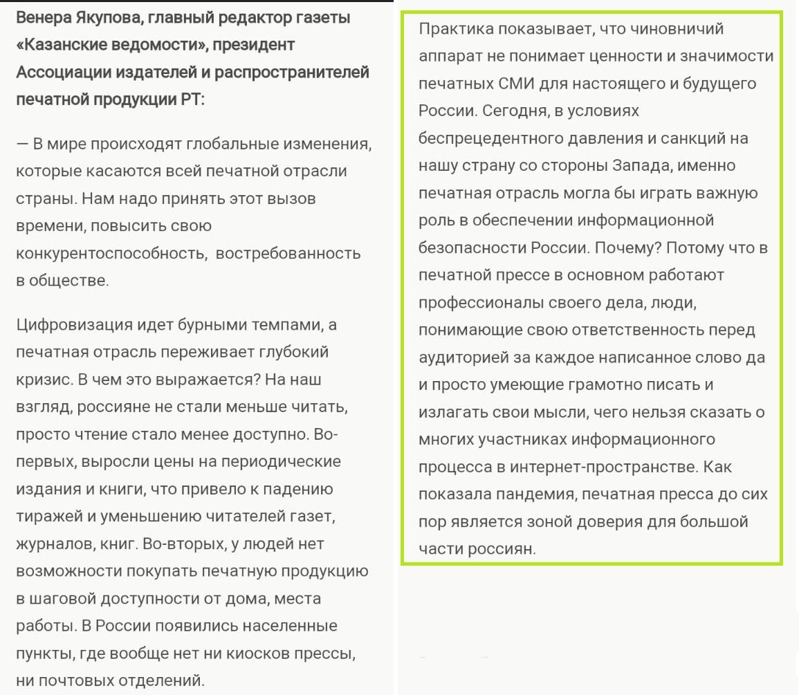 Снова мусолить одно и то же по этому поводу не буду, но вот позиция главреда «Казанских ведомостей» Венеры Якуповой по этому поводу мне показалась интересной, даже немного дерзкой, я бы сказал. Опустим тот факт, что первые аргументы (скрин ее речи привожу) в пользу бумаги — это совсем не аргументы, а попытка надавить на жалость и выпросить дотаций печатной прессе (кажется, сейчас в стране есть более важные статьи расходов для бюджета, чем бумагомарательство).