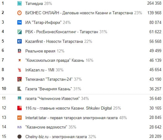 «Реальное время» с 11-го места неделю назад поднялось сразу на шестое, также в десятку вошли и «Челнинские известия». А вот «Вечерняя Казань» им проиграла совсем «копейки» и сместилось на 11-е, хотя неплохо шла на восьмом семь дней назад.