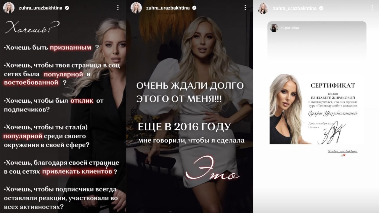 Теперь она учит дам, как стать успешной блогеркой и рубить лавэ на рекламе, хайпить и быть на слуху. Но самое замечательное в этой истории, что Зухра даже выдает сертификаты…имени самой себя. Вот это вообще топ, я считаю.