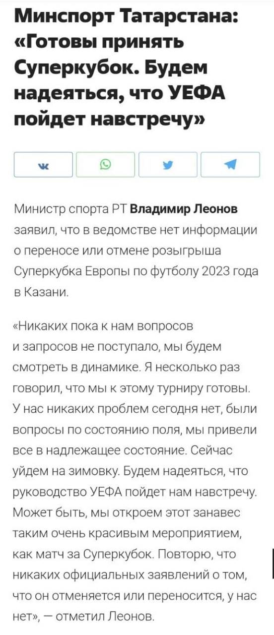 Для тех кто не в теме поясню. Россию напрочь изолировали вообще по всем направлениям, а наш министр говорит про проведение суперкубка Европы по футболу в Казани! Что?! Звучит уже как бред при высокой температуре.