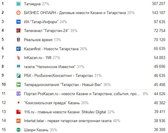 На этот раз в топ-5 произошли довольно интересные изменения. Если тройка лидеров так и осталась забетонированной — объединенный счетчик ресурсов «Татмедиа», «Бизнес-онлайн» и «Татар-информ», то чуть ниже расположились уже «Татарстан-24» и «Реальное время». А они нечастые гости в первой пятерке. Kazanfirst и Prokazan эту зону покинули.