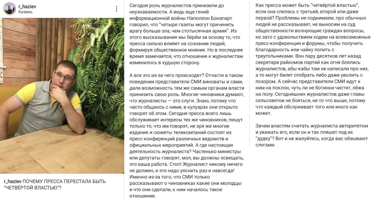 Какой прекрасный «манифест журналиста» от главного пиарщика Татарстана Расима Хазиева, который сам еще недавно работал пресс-секретарем в зеленодольской администрации и строил журналистов.