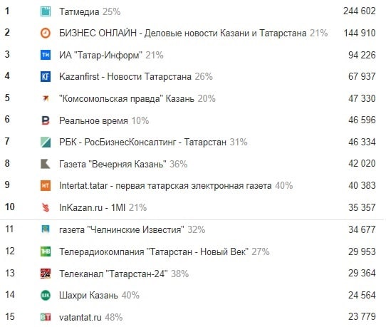 А из новичков в топ-15 пробился сайт Vatantat, который обычно плавает в районе 20-й позиции и ниже. Кроме того, за неделю хорошенько подтянулась «Вечерняя Казань», из глухого подвала выбравшаяся сразу на 8-ю позицию.