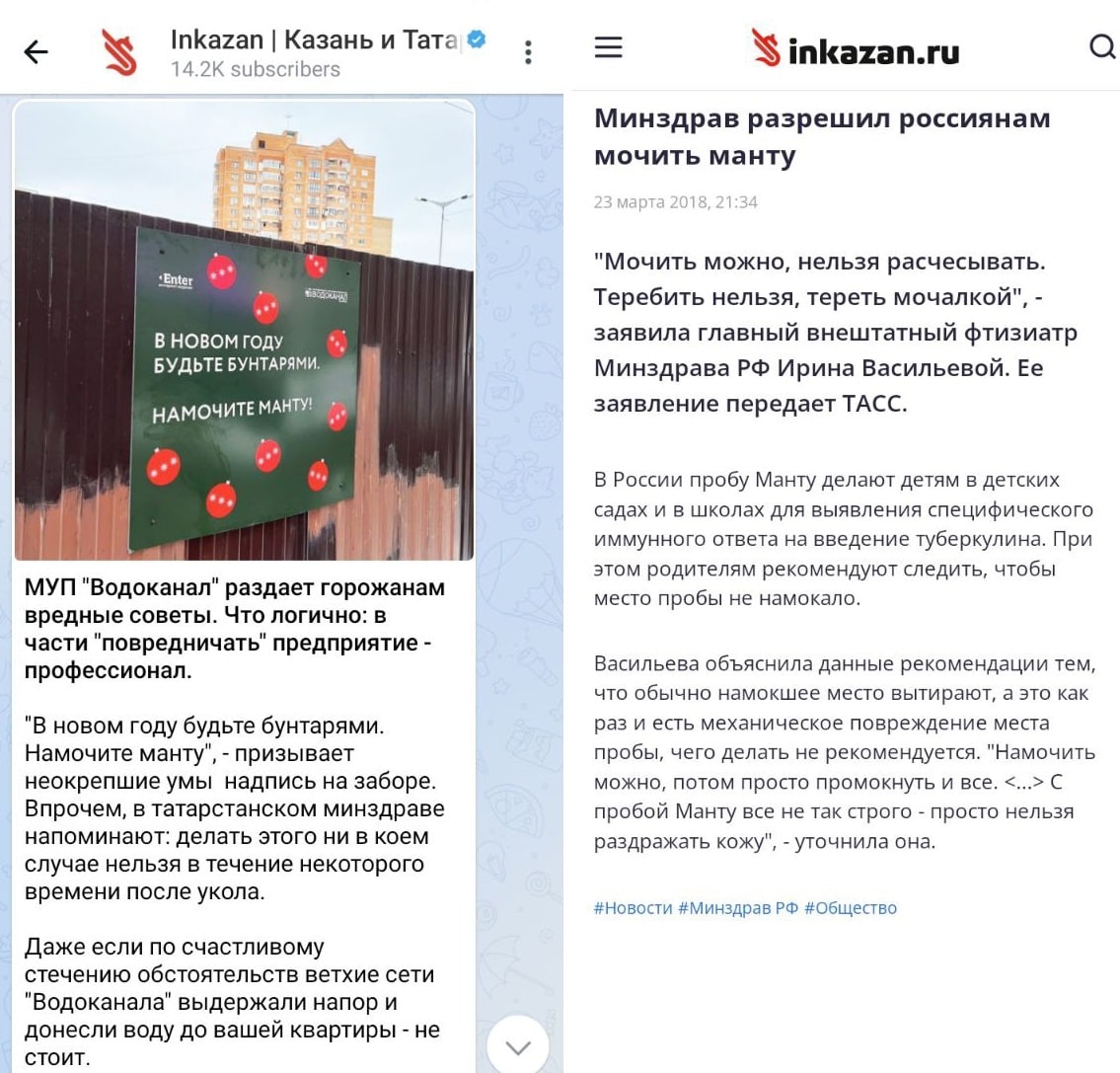 То ли это совсем неуловимая постирония хайпа ради, то ли на полном серьезе Inkazan «разоблачает» водоканаловский креатив на тему «мочения» Манту. Но журы пишут, что так делать нельзя и это очень вредный совет. Хотя сами же когда-то писали, что мочить Манту можно и ссылались на Минздрав.
