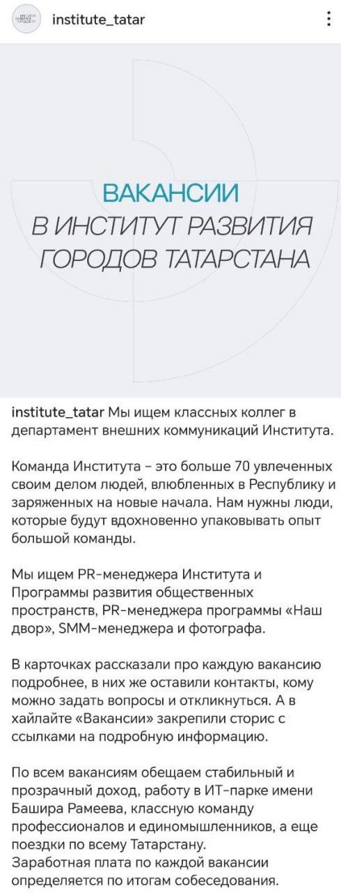 Интересно, что «Институт развития городов Татарстана» не оставляет попыток схантить к себе сильных пиарщиков, чтобы закрыть сразу несколько направлений.