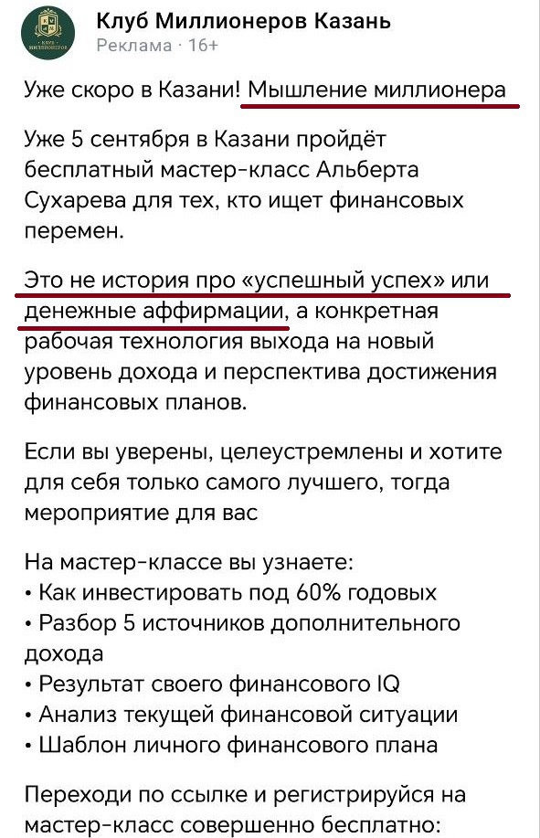 Кстати, «мыслящий миллионер» Альберт Сухарев на бесплатных семинарах толкает слушателям свои платные курсы. Но продажи идут слабо: то ли лохи кончились, то ли денег стало мало у них. Короче, всем сейчас тяжело.