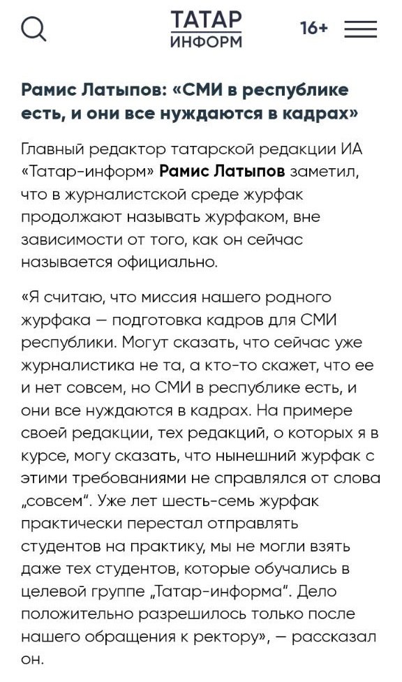 В связи с публикацией о Высшей школе журналистики вы пишете: “А чего раньше-то молчали и публично не выступали?” Информируем вас, что на сайтах "Интертат", "Татар-информ.татар", а также в личных аккаунтах наших журналистов публикации выходили уже с 2018 года. Может быть, по причине того, что они были на татарском языке, эти публикации остались без вашего внимания.