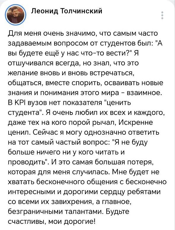 Приветствую, тп. Будем смотреть правде в глаза в контексте вопроса с уходом уважаемого Леонида Толчинского из ВШЖ. Глобально нисколько не имеет значение, кто будет новым руководителем и какой им будет избран путь. Это направление высшего образования себя изжило как таковое. Достаточно оставить какой-нибудь интенсив в рамках курса повышения квалификации – максимум полгода и алга в поля. Даже в айти за полгода можно научиться чему-то. И нечего там штаны протирать на журфаке аж четыре года и больше, это все сказка о потерянном времени.