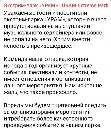 Пярщики парка Урам видимо с подливой облажались, что спешно начали оправдываться за событие в их парке, которое проводилось ни минмолом, ни самим парком. Всё равно все продолжают думать об их непосредственном участии, но мы внутряка не узнаем.