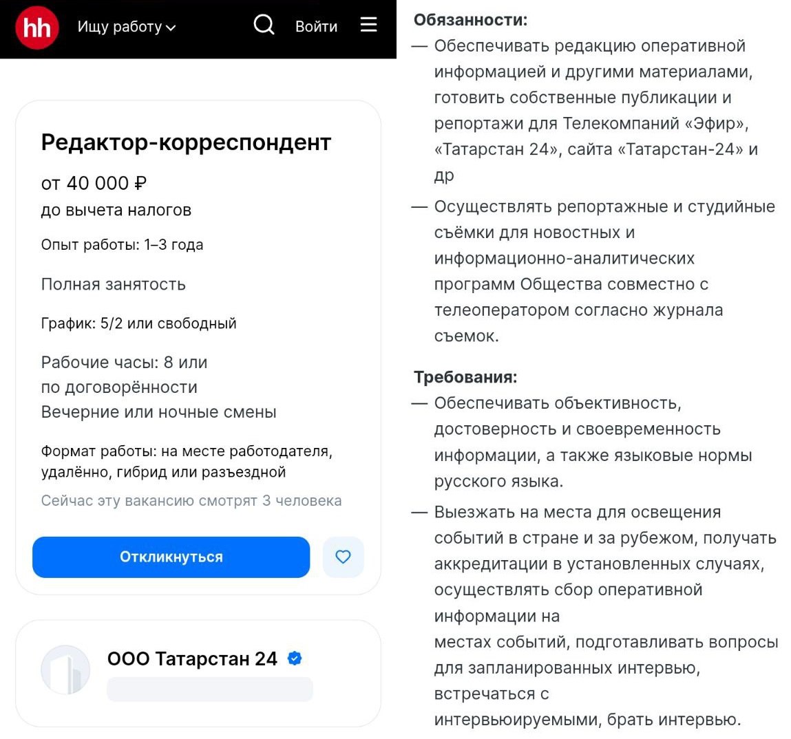 Интересно хантят корреспондентов «Татарстан-24» – судя по вакансии, работать там придется не только в кадре, но и на сайт, и еще куда-то, что эйчары скрыли в этом загадочном «и др».