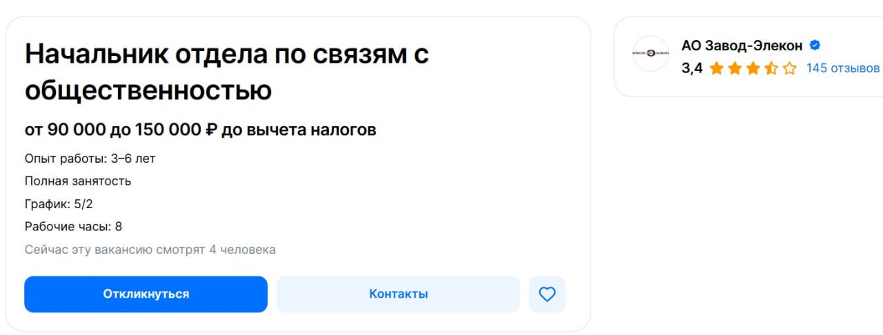 Привет, ттп. Впечатлил размах зп для местной медийки, спешу тебе показать. Завод Элекон как-то продавил бюджеты на пиярщика и внезапно заложили зарплату в 90-150 тысяч. Что для этого завода вообще нонсенс. Несколько лет назад у них эта вакансия висела с зарплатой на 35 тысяч, пиарщики ничтоже сумняшеся пролистывали. Прикол в том, что по словам работавших там, на обещанные деньги выйти сложно. Кипиайки и другие требования помогают подрезать «сверхдоходы» типа непрофильных специалистов. Вжух, и уже получится средняя по рынку. А ну еще сразу грозят «высоким темпом работы», что переводится как «мы тебя выжмем как губку»)