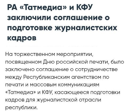 Вдогонку к теме последних дней еще очень интересно звучит недавнее соглашение «Татмедиа» и КФУ, по которому вуз будет готовить для агентства журналистов (или теперь правильно называть спецов более общим термином «медиаспециалистов»?).