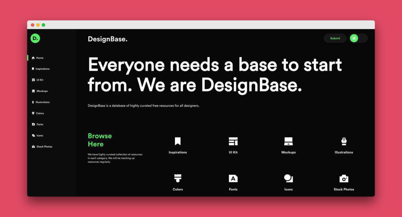DesignBase совмещает в себе комплекты пользовательского интерфейса, ресурсы для вдохновения, иллюстрации, лучшие бесплатные шрифтовые и цветовые ресурсы, сайты с иконками и нормальными стоковыми фотками. Все сайты собраны по категориям — это мегаудобно.