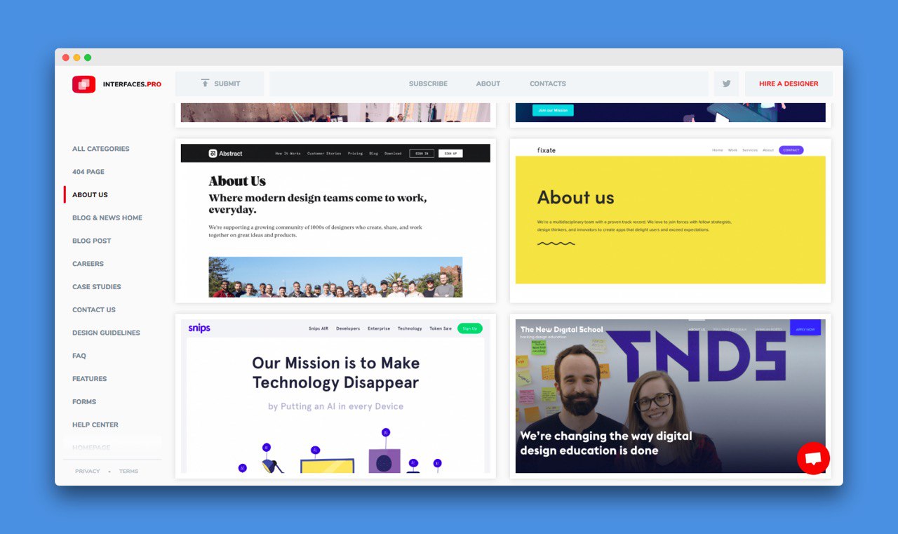Можно залететь и посмотреть к примеру пятьдесят одно решение страницы "О нас". Или формы входа и регистрации (с ними чаще всего проблемы).