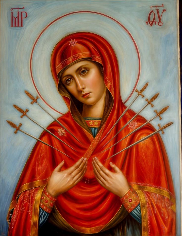 Молитв в честь чудотворной иконы «Семистрельная» много. Они читаются на умягчение злых сердец и умиротворение враждующих.