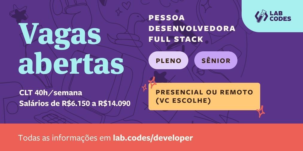 A Labcodes está em busca de pessoas desenvolvedoras de software para trabalhar com a gente! Fizemos recentemente uma reestruração em nossos salários e benefícios, então convidamos vocês para olharem nossas oportunidades.