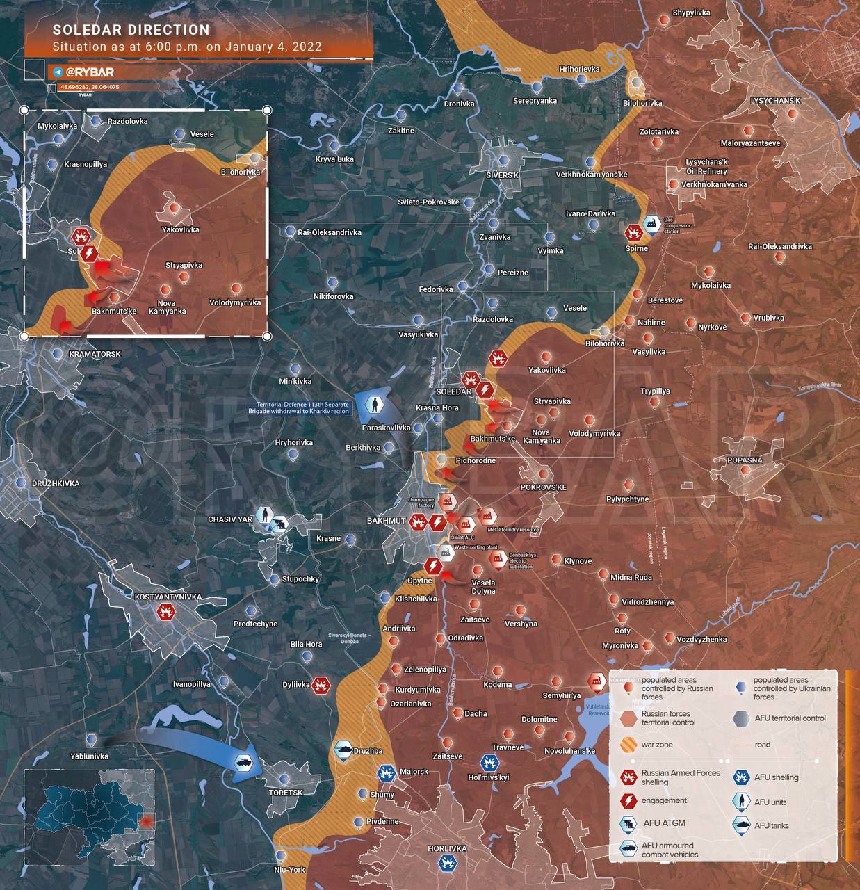 Đồng thời, Lực lượng vũ trang Nga đã thiết lập quyền kiểm soát đối với trạm quan sát của Tiểu đoàn xung kích 109 thuộc Lữ đoàn bộ binh số 10 của Ukraibe tại tuyến Soledar-Veseloye.