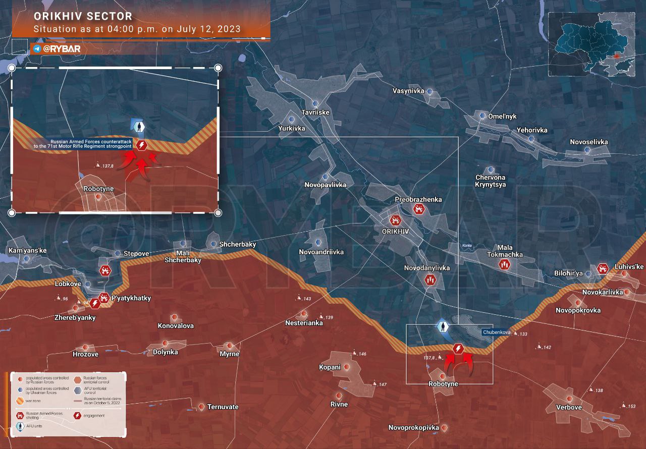 🔻Ở phía đông bắc Rabotino, quân đội Nga đang phản công và đánh bật các nhóm tấn công của lữ đoàn 47 thuộc Lực lượng Vũ trang Ukraine khỏi cứ điểm của trung đoàn súng trường cơ giới 71 của Nga, nơi mà Ukraina đã có thể chiếm giữ với cái giá phải trả là tổn thất nặng nề về người và thiết bị vào hai ngày trước.