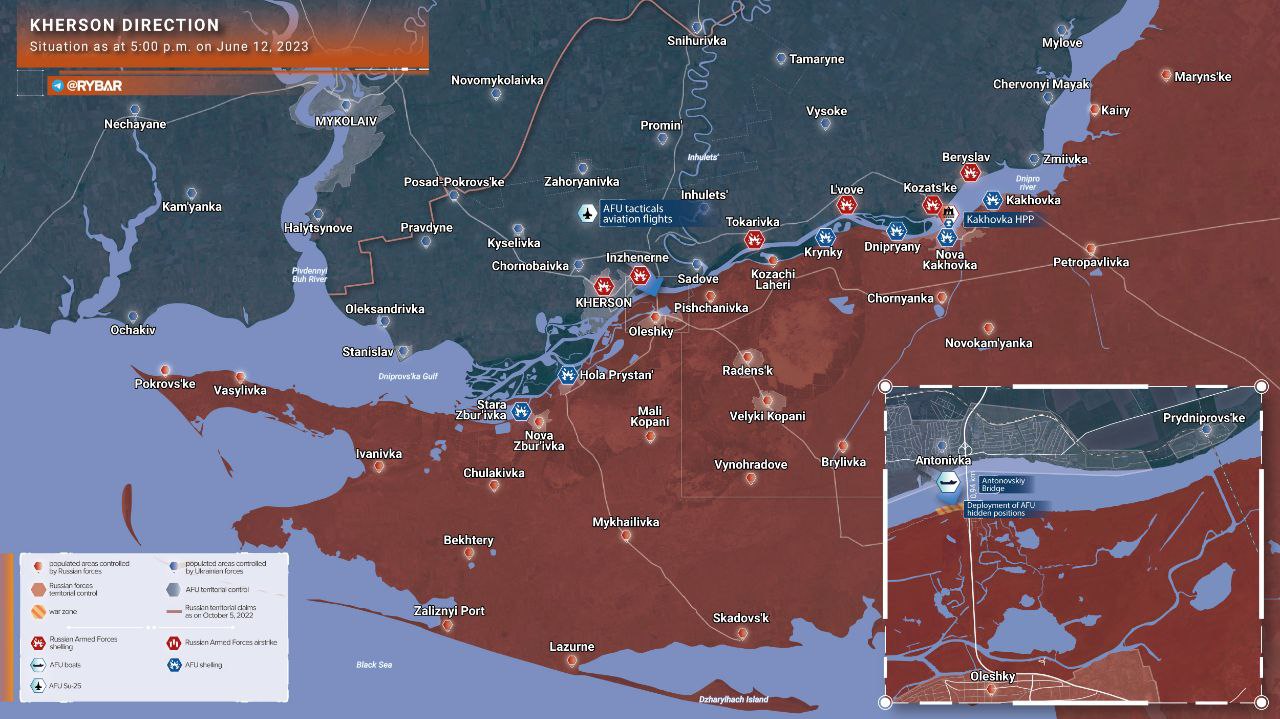 🔻Đội hình Ukraine tiếp tục tiếp tế cho các nhóm đã đổ bộ tại khu vực cầu Antonovsky với sự hỗ trợ của xuồng cao tốc. Họ bị tấn công bởi pháo binh Nga từ khu vực Kherson và Sadovy.