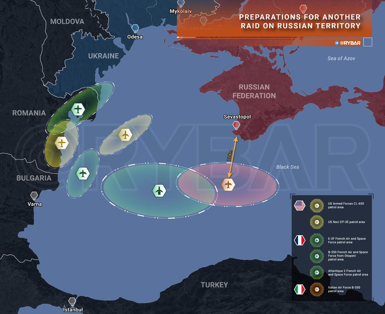 Trong số đó còn có một máy bay E-3F AWACS của Pháp, sự hiện diện của nó là dấu hiệu báo trước cho một cuộc tấn công sắp tới ở miền nam nước Nga. Đồng thời, cách tiếp cận của máy bay trinh sát điện tử B-350 của Không quân Ý, cách bờ biển phía nam Krum 72 km, cũng đáng chú ý.