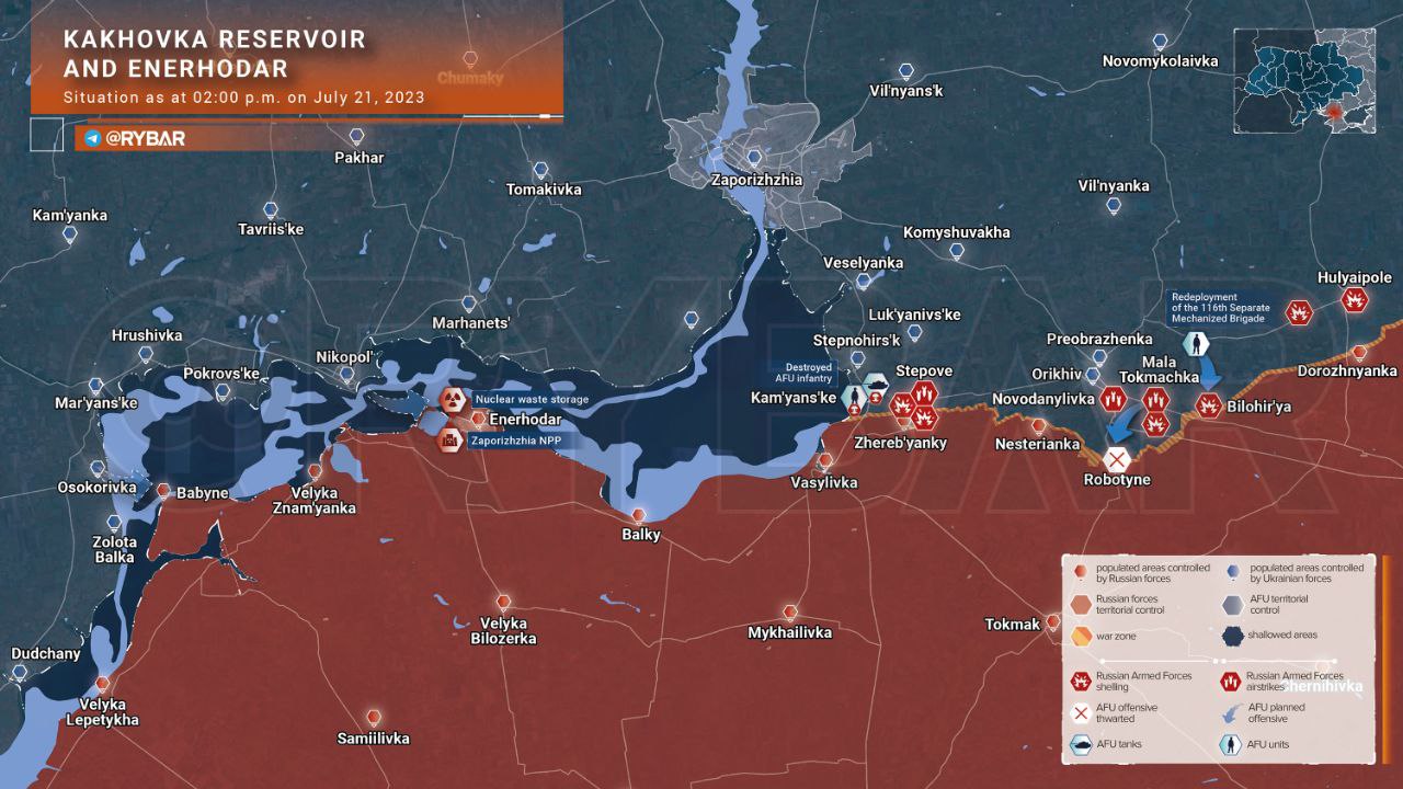 🔻Trong khu vực Orekhov, lực lượng Ukraina đã cố gắng tấn công Rabotino một lần nữa vào cả ngày hôm qua và cả vào đêm 21 tháng 7. Bây giờ các đơn vị của Lực lượng Vũ trang Ukraine đang tập hợp lại cho cuộc tấn công tiếp theo.