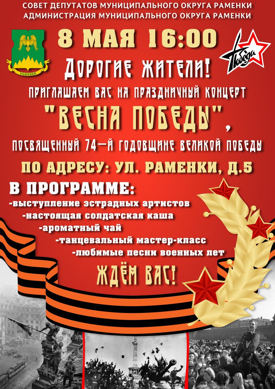 Приглашаем принять участие на празднике «Весна Победы», который состоится 8 мая 2019 года в 16:00 по адресу: ул. Раменки, 5.