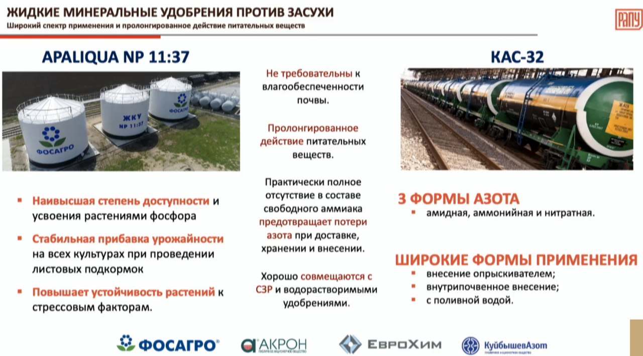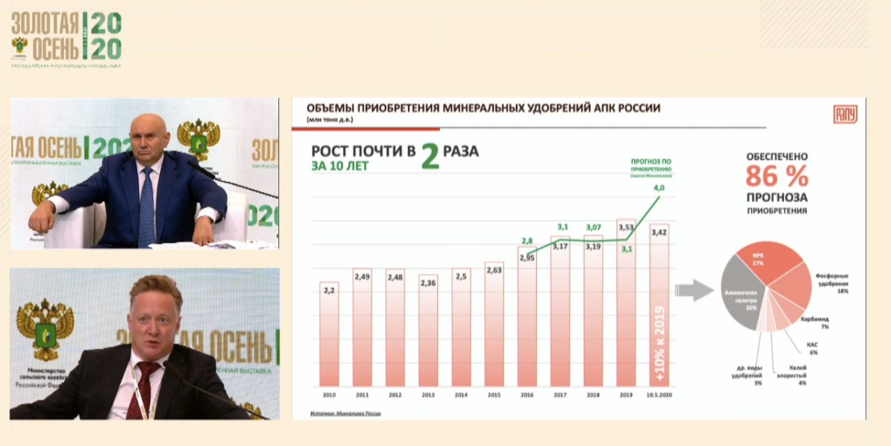«Мы настаиваем на дальнейшем проведении масштабных семинаров, совещаний от уровня регионов до муниципалитетов: разъяснить, предложить, показать, убедить каждого агрария, не зависимо от его объемов производства, в эффективности на примере тех, кто уже это делает, внесения жидких минеральных удобрений», — сказал первый замглавы Минсельхоза России Джамбулат Хатуов, выступая в рамках выставки «Золотая осень — 2020».